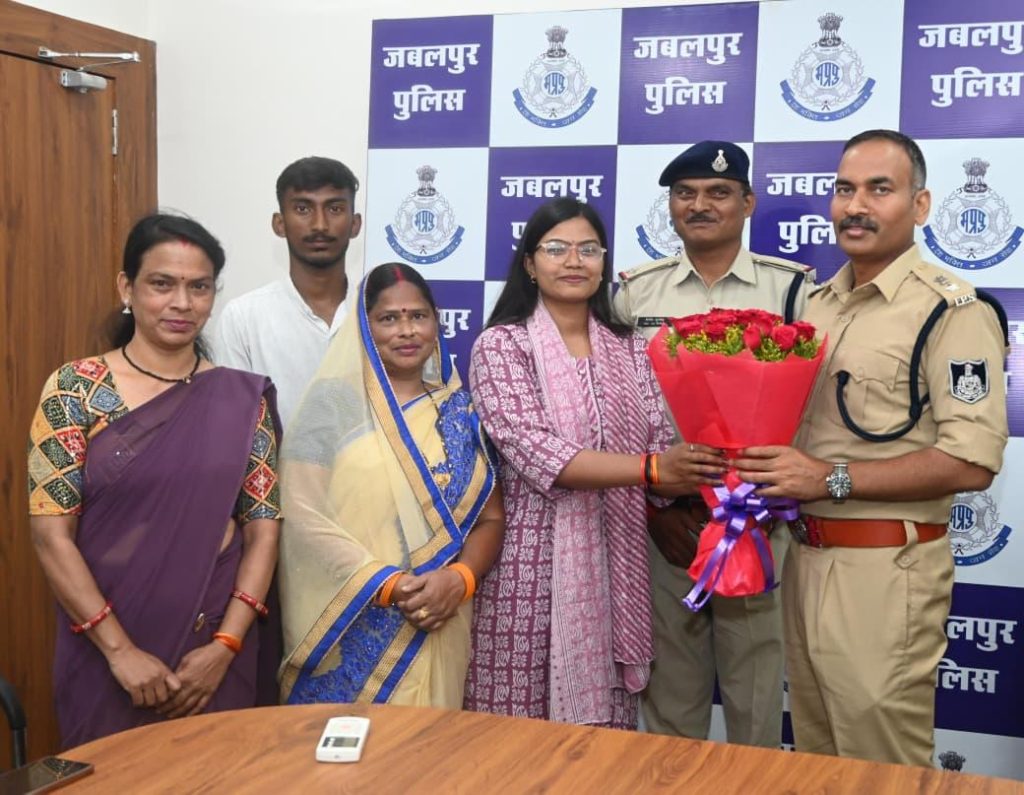 एम.पी.पी.एस.सी. में चयनित होने पर थाना हनुमानताल में पदस्थ सहायक उप निरीक्षक विनोद सुरकेल की पुत्री कु. सुरभि सुरकेल को पुलिस अधीक्षक जबलपुर श्री सम्पत उपाध्याय ने पुष्पगुच्छ एवं स्मृति चिन्ह भेंट कर सम्मानित